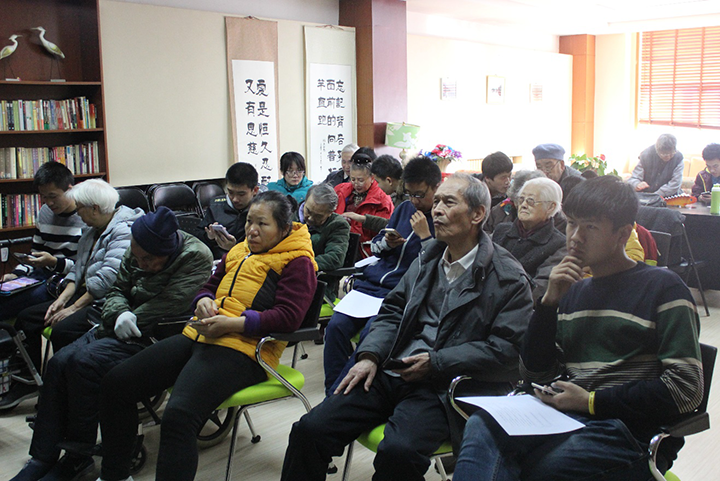 在大课阶段,老人们认真地学习毛恩阳同学所讲授的内容,并与身边的志愿者小声交流着。